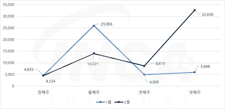 2월 한달 동안 악성코드 진단 현황을 주 단위로 살펴보았을 때 1월에 비해 증가한 추이를 보이고 있다.