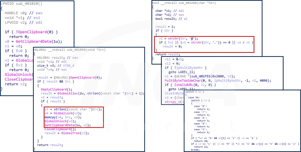 "ClipBanker" 악성코드가 실행 중일 때 사용자가 복사한 내용 중 이메일, URL 및 암호 화폐 지갑 주소의 형식이 있는지 확인한다. 이 과정에서 이메일의 경우 “@”와 “.” 문자가 있는지 확인하고 URL은 IsValidURL API를 사용해 문자열의 유효성 여부를 검증한다. 또한, 암호 화폐 지갑 주소는 Dogecoin, Bitcoin 및 Ethereum 등 공격자가 사전에 만들어둔 암호 화폐 지갑 주소의 키워드와 조건이 맞는지 확인한 후, 최종적으로 앞서 언급한 리소스 내용에 있는 공격자의 데이터를 기반으로 클립보드를 변경한다.