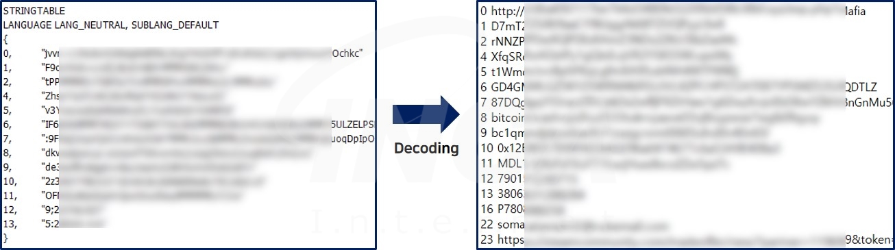 해당 악성코드에서 사용하는 C&C 서버 주소나 공격자 암호 화폐 지갑 등의 정보는 리소스 섹션에 저장됐으며, 해당 정보를 디코딩하면 [그림 2]와 같이 악성코드에서 사용할 정보를 확인할 수 있다.