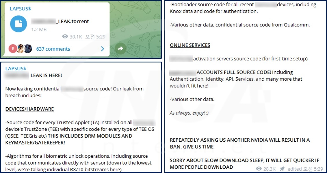 최근 국내 대기업이 사이버 공격을 받아 피해 업체의 내부 자료가 유출됐다. 피해 업체를 공격한 것으로 알려진 해외 해커 조직 LAPSUS$는 탈취한 데이터 약 190GB를 파일 공유 프로그램인 토렌트에 업로드하며 자신들이 공격했다고 주장했다.