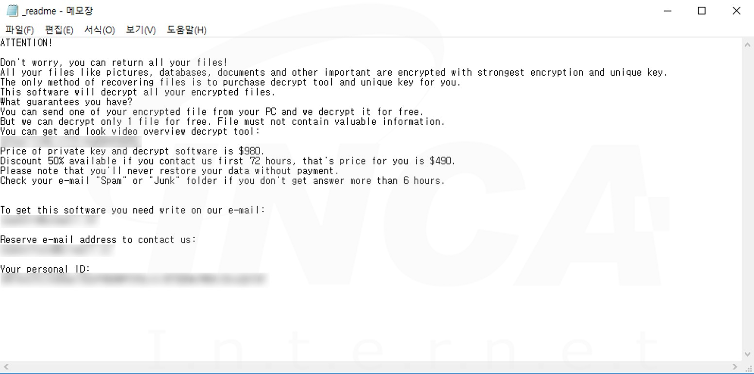 파일명에 ".vtym" 확장자를 추가하고 “_readme.txt"라는 랜섬노트를 생성하는 "Stop" 랜섬웨어의 변종이 발견됐다. 해당 랜섬웨어는 공격자의 C&C 서버에 연결을 시도한다.