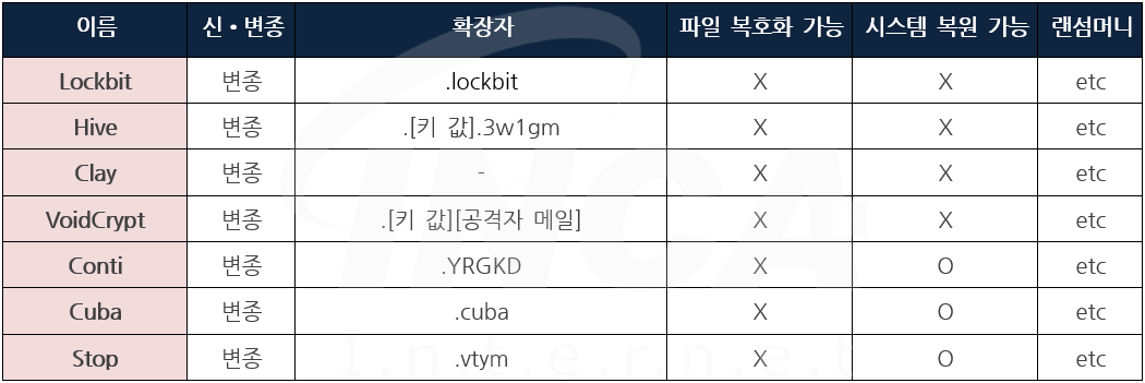 잉카인터넷 대응팀은 2022년 3월 4일부터 2022년 3월 10일까지 랜섬웨어 신•변종 및 이슈와 관련하여 대응을 진행하였으며, 변종 랜섬웨어는 "Lockbit"외 6건이 발견됐다.