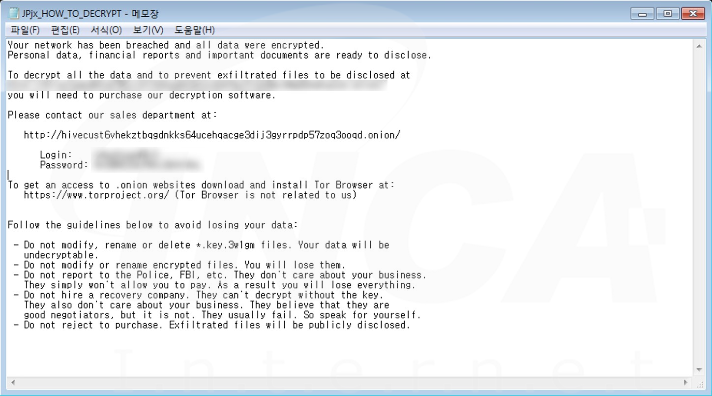 파일명에 ".[키 값].3w1gm" 확장자를 추가하고 "JPjx_HOW_TO_DECRYPT.txt"라는 랜섬노트를 생성하는 "Hive" 랜섬웨어의 변종이 발견됐다. 해당 랜섬웨어는 시스템의 복원을 무력화한다.