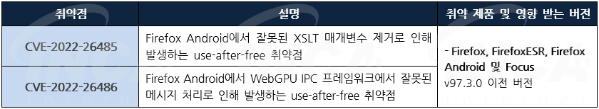 - Firefox, Firefox ESR, Firefox Android 및 Focus v97.3.0 및 이후 버전