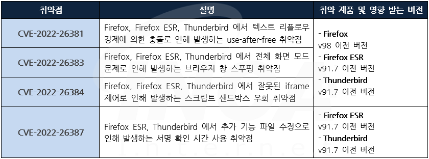 Mozilla 사는 제품에서 발생하는 취약점에 대한 보안 업데이트를 발표하고, 관련 취약점을 해결하기 위해 최신 버전으로 업데이트할 것을 권고하였다.