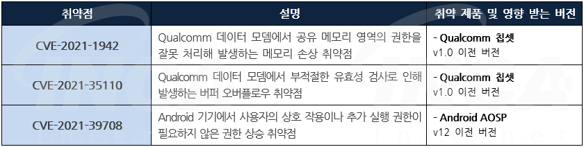 Samsung과 Qualcomm 사는 Android 제품에서 발생하는 취약점에 대한 보안 업데이트를 발표하고, 관련 취약점을 해결하기 위해 최신 버전으로 업데이트할 것을 권고하였다.