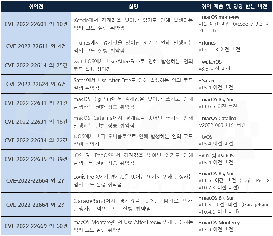 Apple 사는 제품에서 발생하는 취약점에 대한 추가 보안 업데이트를 발표하고, 관련 취약점을 해결하기 위해 최신 버전으로 업데이트할 것을 권고하였다.