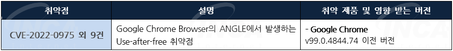 Google 사는 Google Chrome에서 발생하는 취약점에 대한 보안 업데이트를 발표하고, 관련 취약점을 해결하기 위해 최신 버전으로 업데이트할 것을 권고하였다.
