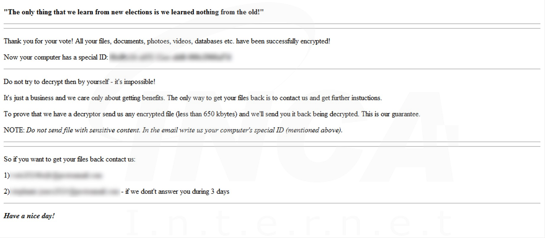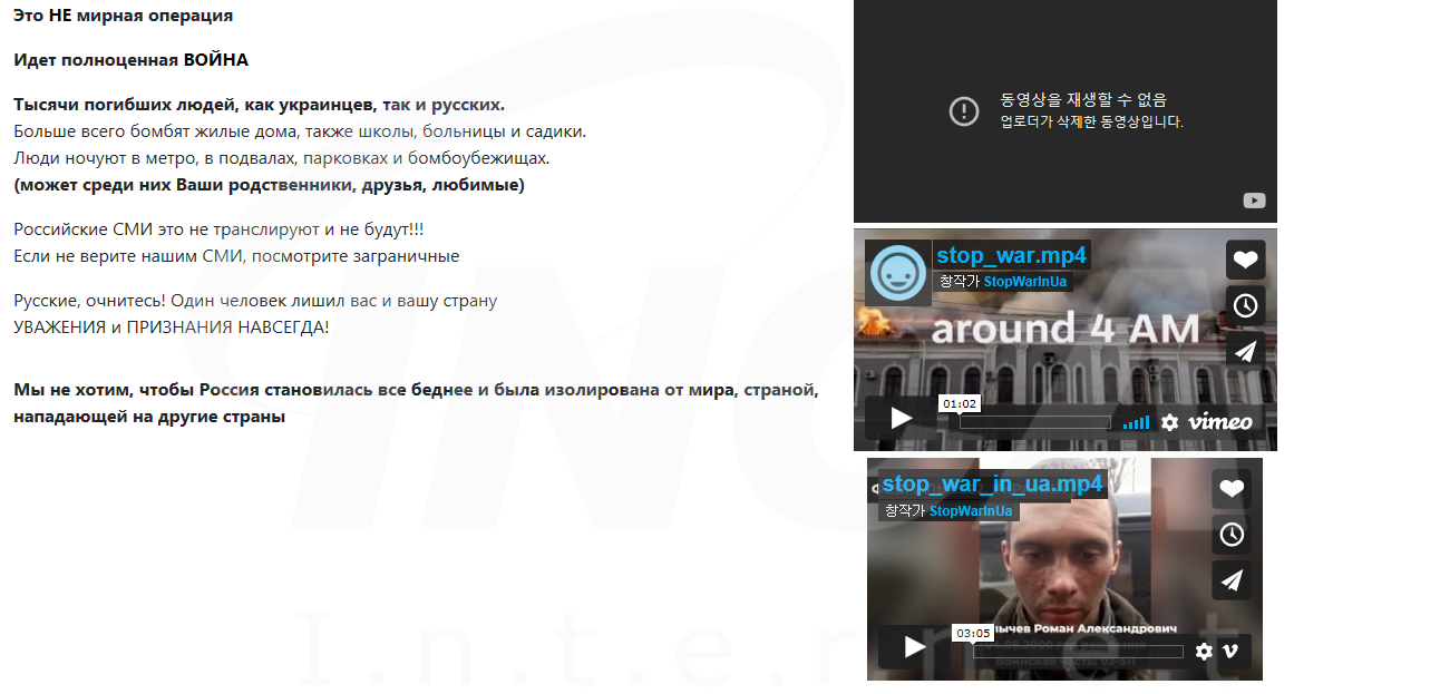 파일명에 ".putinwillburninhell" 확장자를 추가하고 " RUSSKIJ VOENNIJ KORABL IDI NAHUJ.html"라는 랜섬노트를 생성하는 "AntiWar" 랜섬웨어가 발견됐다.