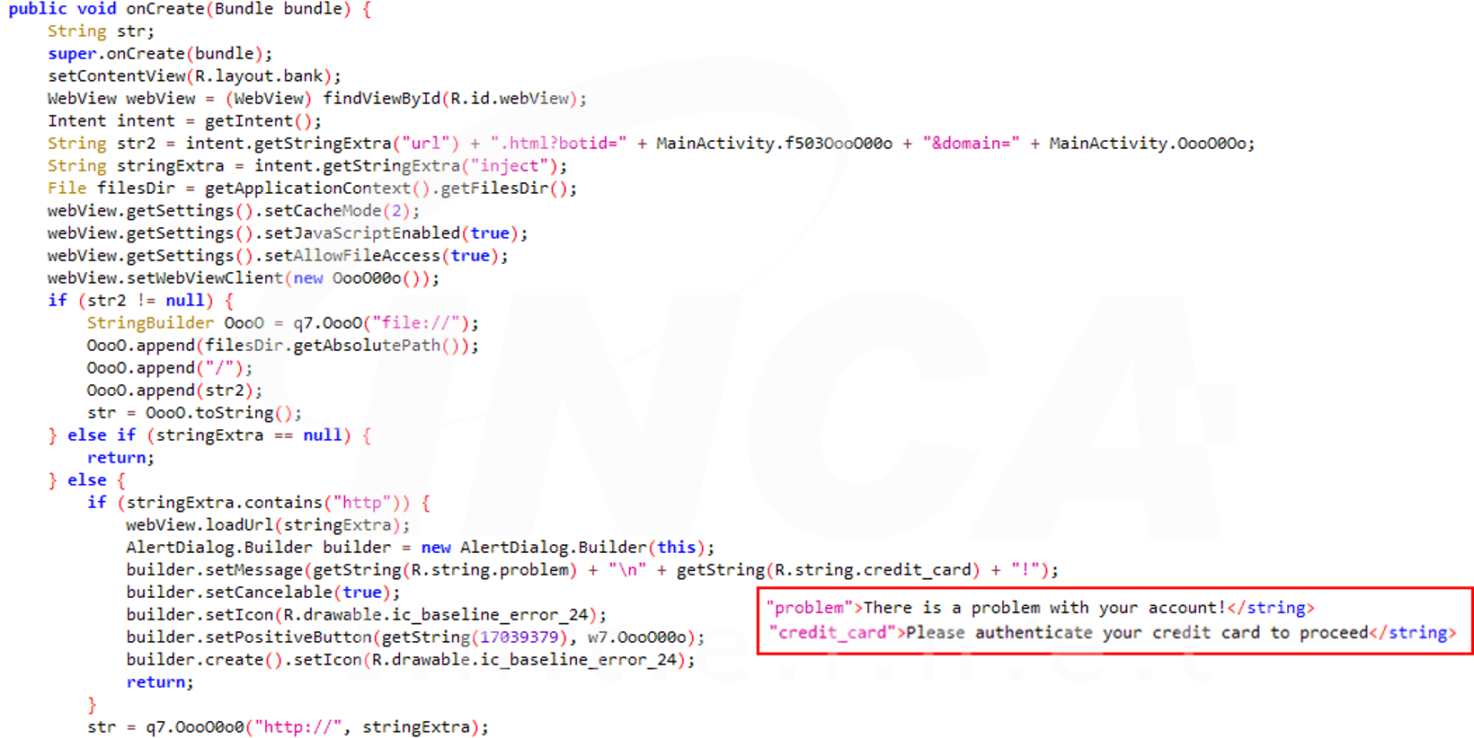 위의 악성 동작 중 "Inject a web page" 명령은 원격지에서 URL을 받아온다. 해당 URL은 로드되어 오버레이 동작으로 이어진다. 그 주소는 확인되지 않아 정확한 웹 페이지는 알기 어렵지만, 아래 빨간 상자에 메시지를 띄우는 것으로 보아, 신용카드 정보 입력을 유도하는 것으로 추정된다.