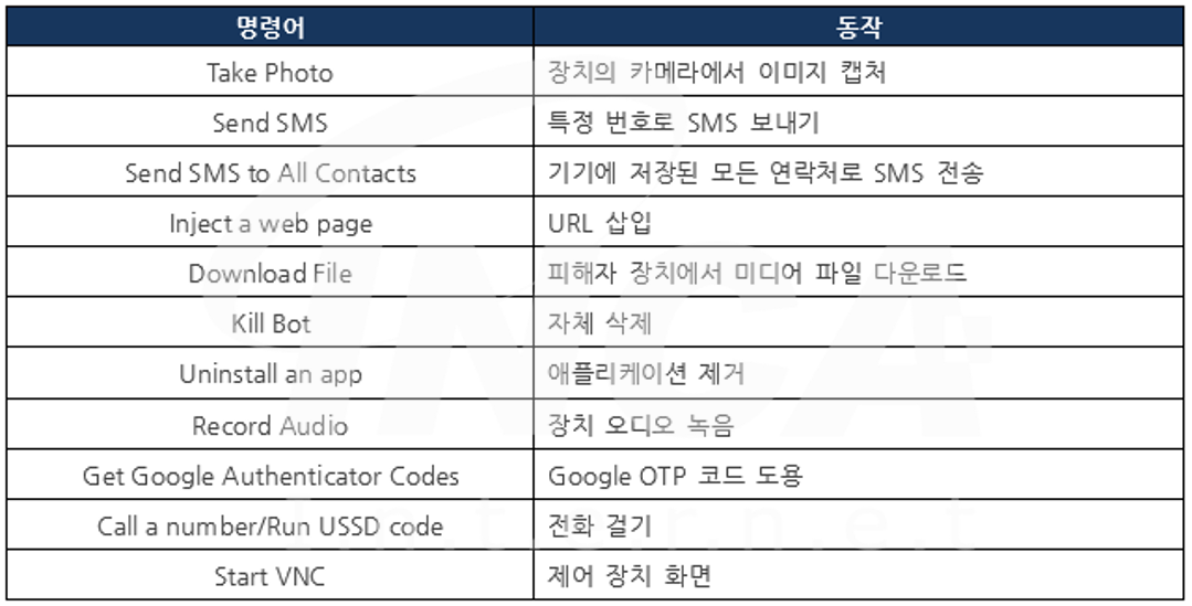 그리고 원격지와 통신하며, Bot의 기능을 수행한다. 아래의 표에서 보이는 것과 같이 명령을 받아 다음 동작을 수행할 수 있다.