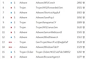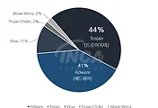1월 한달 간 탐지된 악성코드를 유형별로 비교하였을 때 Trojan(트로이목마)과 Adware(애드웨어)가 둘다 46%로 가장 높은 비중을 차지하였고, Virus(바이러스)가 3%, Trojan-Clicker(트로이목마-클리커)와 Abuse-Worry가 각각 2%로 그 뒤를 따랐다.