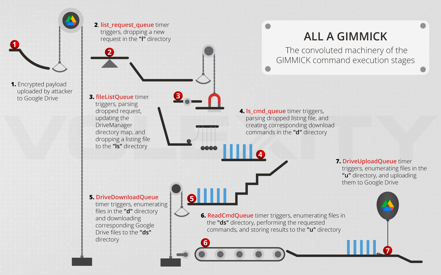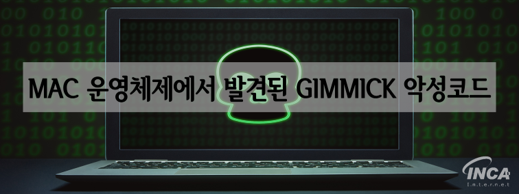 해당 업체는 이 악성코드가 Apple사의 MAC 운영체제에서 발견됐으며 중국의 해킹 조직 "StormCloud"의 사이버 공격에 사용된다고 알렸다. 또한, "GIMMICK"은 클라우드 서비스인 Google Drive를 C&C서버로 사용하며 피해자의 파일 다운로드와 시스템 정보 수집 등의 악성 행위를 시도한다고 알려졌다.