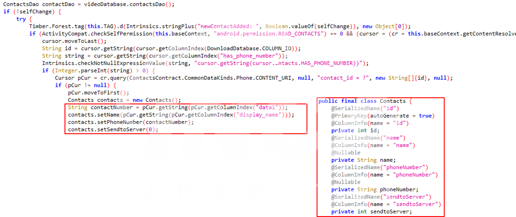 위의 에뮬레이터 탐지 코드 실행이 후, 실 단말기로 확인되면 문자메시지, 연락처, 통화 기록의 정보를 탈취한다. 아래의 코드는 연락처 정보를 탈취하는 코드로, 'ContactsContract.Contacts.CONTENT_URI'에 새로운 연락처가 추가되는 것이 탐지되면 전화번호와 이름을 탈취한다. 그 외에도 수/발신 문자메시지와 통화 기록에서 새로운 데이터가 탐지되면 해당 정보를 탈취한다.