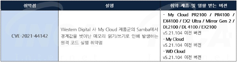 Western Digital 사는 제품에서 발생하는 취약점에 대한 보안 업데이트를 발표하고, 관련 취약점을 해결하기 위해 최신 버전으로 업데이트할 것을 권고하였다.