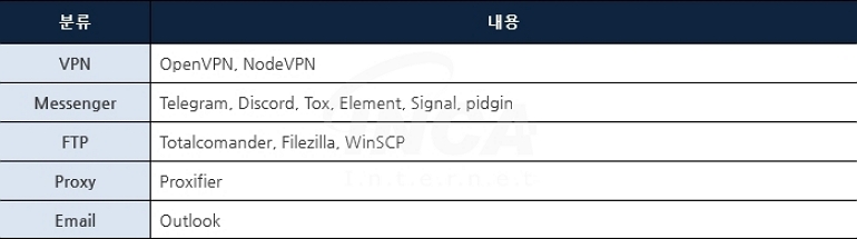 브라우저와 암호화폐 지갑 관련 정보 외에도 VPN, Messenger 및 FTP 등의 프로그램 정보를 수집한다.
