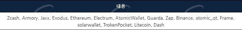 암호화폐 지갑 정보의 수집은 [표 4]의 목록을 대상으로 진행하며, ‘%AppData’%’ 경로에서 대상과 관련된 폴더가 있는지 확인하고 정보를 지정된 경로로 복사한다.