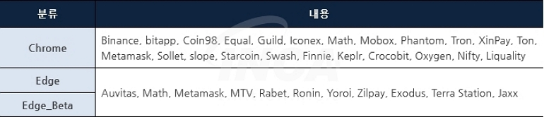 추가로 크롬과 Edge 브라우저에서 사용 중인 확장 프로그램을 조회한 후, 암호화폐 지갑과 관련된 확장 프로그램에 해당하면 정보를 수집한다.