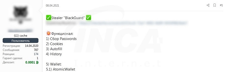 현재, “BlackGuard” 악성코드는 해킹 포럼에서 200 ~ 700 달러의 가격에 판매되고 있다. 게시글에 따르면, 다수의 브라우저 및 암호화폐 지갑 등에서 정보를 수집해 공격자에게 전송하며, 분석을 방지하기 위해 안티 디버깅 기법 및 난독화 등이 적용됐다고 알려졌다.