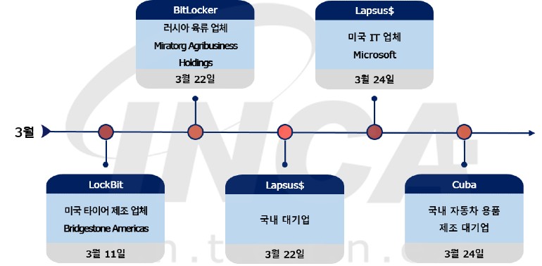 2022년 3월(3월 1일 ~ 3월 31일) 한 달간 랜섬웨어 동향을 조사한 결과, 미국 타이어 제조 업체 Bridgestone Americas가 “LockBit” 랜섬웨어 공격을 받은 정황이 발견됐으며, 국내 대기업 및 미국 IT 업체 Microsoft가 “Lapsus$” 랜섬웨어 공격을 받은 사건이 있었다. 또한, 러시아 육류 업체 Miratorg Agribusiness Holdings와 국내 자동차 용품 제조 대기업이 각각 “BitLocker” 랜섬웨어와 “Cuba” 랜섬웨어 공격을 받았다.