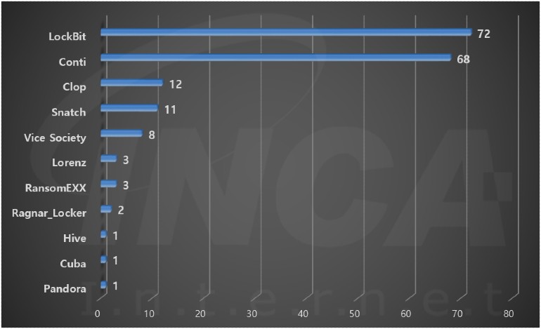 2022년 3월(3월 1일 ~ 3월 31일)에 발생한 데이터 유출 현황을 랜섬웨어 진단명 별로 비교하였을 때 “LockBit” 랜섬웨어가 72건으로 가장 많은 데이터 유출이 있었고, “Conti” 랜섬웨어가 68건으로 두번째로 많이 발생했다.