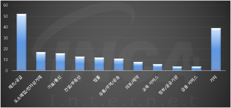 2022년 3월(3월 1일 ~ 3월 31일)에 발생한 데이터 유출 건을 산업별로 비교하였을 때 제조/공급 분야가 가장 많은 공격을 받았고, 도소매업/전자상거래 분야가 그 뒤를 따랐다.