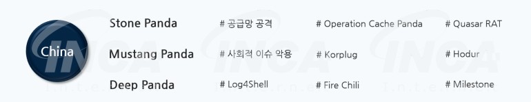 1분기에는 대만의 금융기관을 공격한 배후로 Stone Panda 가 지목되었으며, Mustang Panda 해커 그룹은 사회적 이슈를 이용한 피싱 공격을 수행하였다. 또한, Deep Panda 해커 그룹이 Log4Shell 취약점을 이용해 악성코드를 유포하였다.