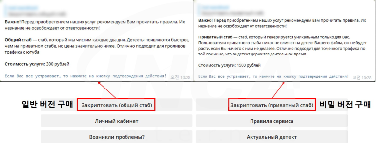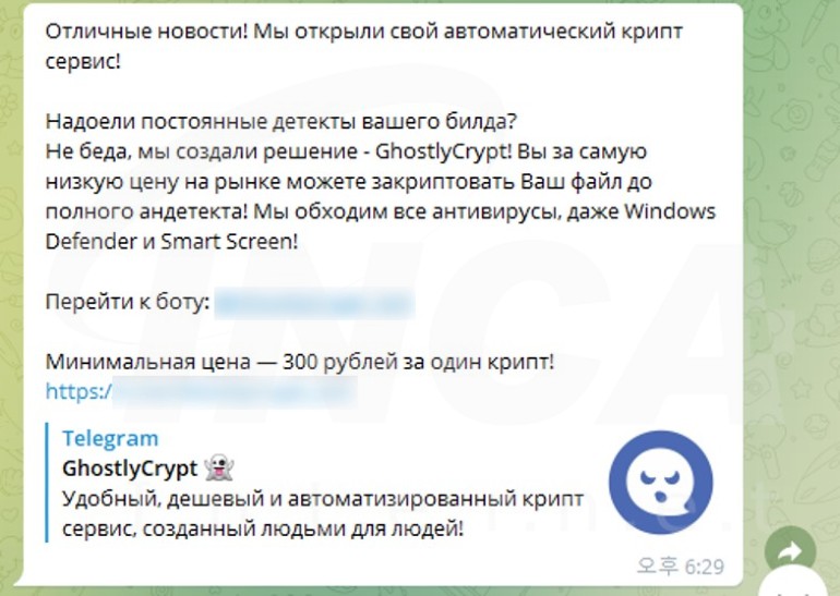 또한, 동시에 판매중인 “ExoCrypt” 암호화 악성코드는 “GinzoStealer”의 백신 탐지 우회 시도를 도와주며 300루블에 판매됐다. 하지만 현재는 해당 암호화 툴의 개발을 중지했으며 새로운 “GhostlyCrypt” 라는 암호화기 악성코드를 판매 중에 있다. 이 경우, 고객끼리 키를 공유하는 일반 버전과 고객마다 키를 발급해주는 비밀 버전이 존재하며 각각 300루블, 1500루블에 판매된다.