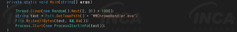 “ExoCrypt” 암호화기를 실행하면 “%TEMP%” 경로에 실행 압축 파일인 “ChromeHandler.exe” 파일을 드랍한다. 해당 파일은 원본 파일 내부에 난독화 상태로 저장돼 있다.