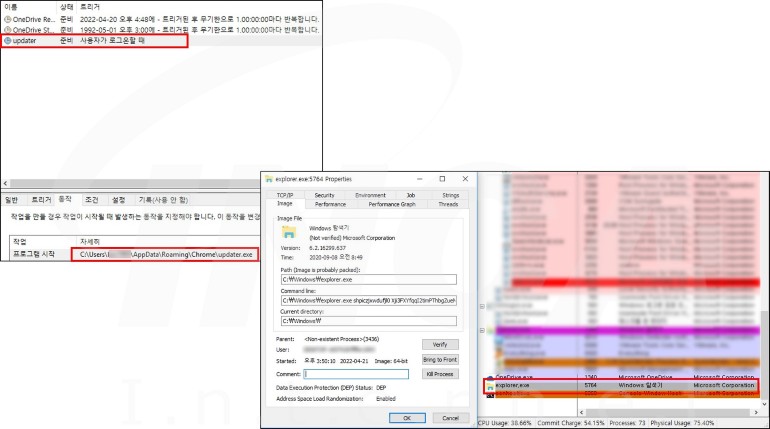 다운로드된 “XMRig”는 명령 프롬프트를 통해 암호화된 파워쉘 코드를 실행하며 해당 파워쉘 코드는 “Windows Defender”에 코인 마이너를 예외 처리한다. 그 후, 작업 스케줄러에 등록하여 재부팅 시에도 실행될 수 있도록 한다. 최종적으로 “XMRig”는 정상 프로그램인 “explorer.exe”에 인젝션돼 사용자의 PC에서 불법으로 암호화폐를 채굴한다.