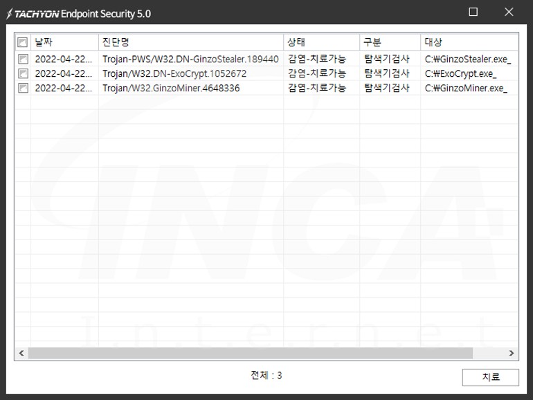 상기 악성코드는 잉카인터넷 안티바이러스 제품 TACHYON Internet Security 5.0에서 진단 및 치료가 가능하다.
