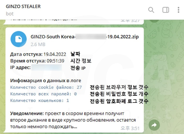 탈취 정보를 “Ginzoarchive.zip”이라는 이름으로 압축하여 공격자에게 전송한다. 전송된 압축 파일은 해당 악성코드를 구매한 고객의 텔레그램으로 확인이 가능하며 “GINZO-[국가]-[IP]-[날짜].zip”이라는 파일명으로 다운로드 가능하다.