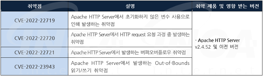 Apache 소프트웨어 재단은 자사의 HTTP Server에서 발생하는 취약점을 해결한 보안 업데이트 발표하고, 관련 취약점을 해결하기 위해 최신 버전으로 업데이트할 것을 권고하였다.