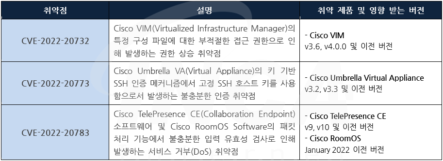 Cisco 사는 제품에서 발생하는 취약점에 대한 보안 업데이트를 발표하고, 관련 취약점을 해결하기 위해 최신 버전으로 업데이트할 것을 권고하였다.