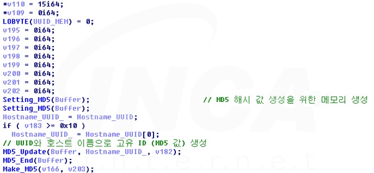 이후, 수집한 정보를 토대로 MD5 해시 값을 생성하며 생성된 값은 공격자 서버와 통신할 때 사용되는 고유 ID로 사용된다.