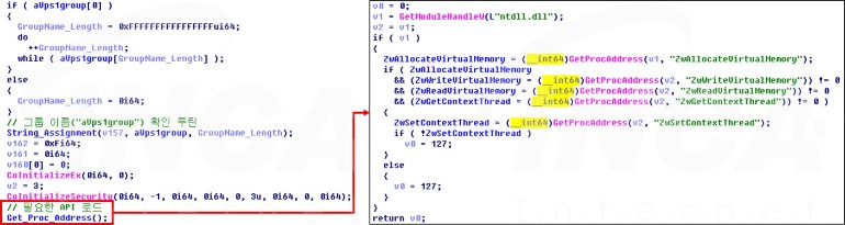 바로 가기 파일을 통해 DLL 파일이 실행되면 “aVps1group”라는 이름의 그룹 ID를 사용하여 시작된다. 이후, 해당 악성코드에서 사용할 모듈을 로드하여 악성 동작을 수행할 준비를 마친다.