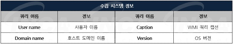 또한, 감염된 PC의 고유 ID 생성을 마치면 해당 ID를 구분하기 위한 시스템 정보를 추가적으로 수집한다. 수집하는 정보는 [표 1]과 같다.