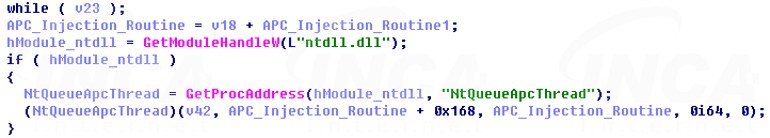 마지막으로 “NtQueueAPCThread” API를 호출하여 APC 인젝션을 마치고, 공격자가 작성한 페이로드를 실행한다.