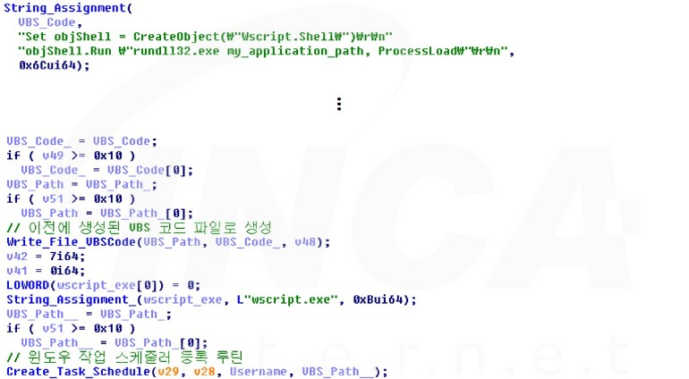 공격자의 명령이 “Ins” 일 경우는 “Bumblebee”의 DLL 파일을 “%APPDATA%”에 복제하고, 해당 DLL 파일을 로드하는 VBS 파일을 생성한다. 파일 생성을 마치고 해당 VBS 파일을 실행하도록 작업 스케줄러에 등록한다.