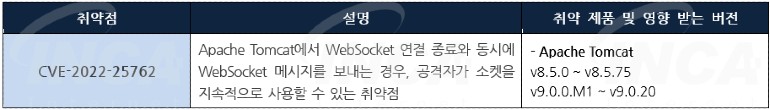 Apache Tomcat에서 신규 취약점을 해결한 보안 업데이트 발표하고, 관련 취약점을 해결하기 위해 최신 버전으로 업데이트할 것을 권고하였다.