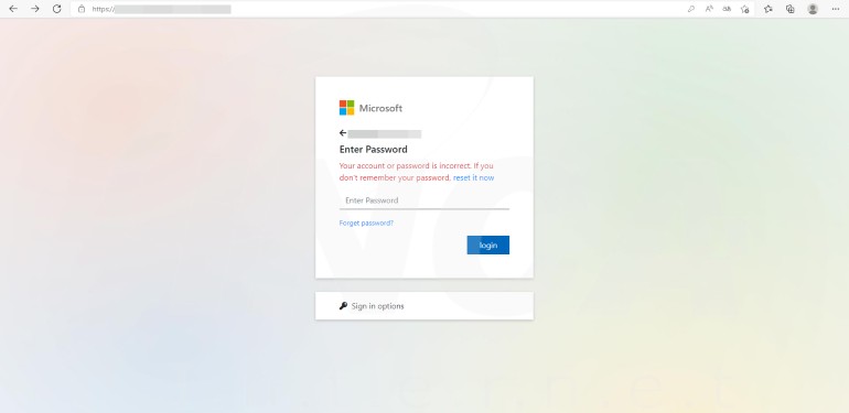 이후, 사용자가 Microsoft 이메일 주소와 패스워드를 입력하면 잘못된 비밀번호라는 문구가 나온다. 이는 사용자가 무작위로 패스워드를 입력하는 것에 대한 방안으로 적용된 기법으로 추정된다.