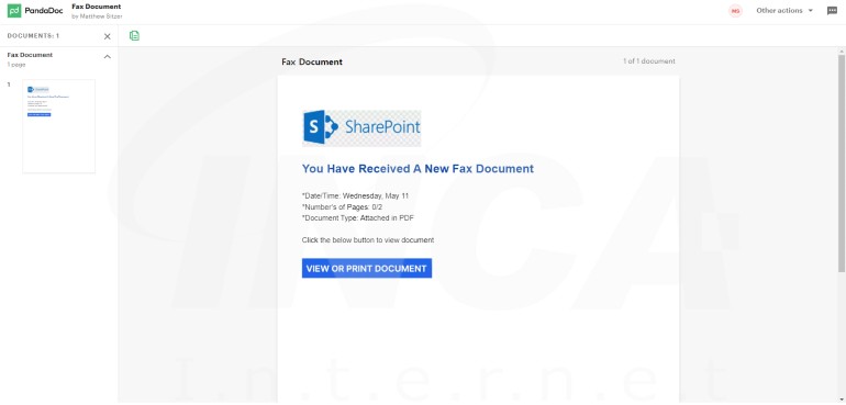 메일에 첨부된 링크를 클릭하면 가짜 팩스 정보를 포함하는 또 다른 웹페이지로 리디렉션된다. 해당 페이지에는 팩스 수신 날짜, 문서 매수 및 타입에 대한 정보가 상세하게 적혀있어 사용자들로 하여금 가짜 팩스 문서라는 의심을 피하고 문서를 확인하도록 유도한다.