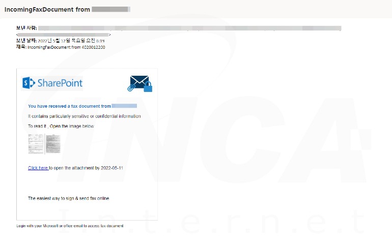 아래의 피싱 메일은 "IncomingFaxDocument from ○○○○○"이라는 제목으로 유포되며, 수신한 팩스를 확인하기 위해 메일에 첨부된 하이퍼링크를 클릭할 것을 유도하고 있다.