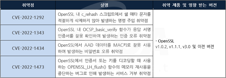 OpenSSL 은 제품에서 발생하는 취약점에 대한 보안 업데이트를 발표하고, 관련 취약점을 해결하기 위해 최신 버전으로 업데이트할 것을 권고하였다.