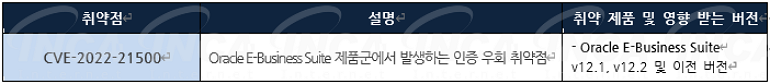 오라클 사는 자사 E-Business Suite 제품의 보안 취약점에 대한 패치 발표하고, 관련 취약점을 해결하기 위해 최신 버전으로 업데이트할 것을 권고하였다.