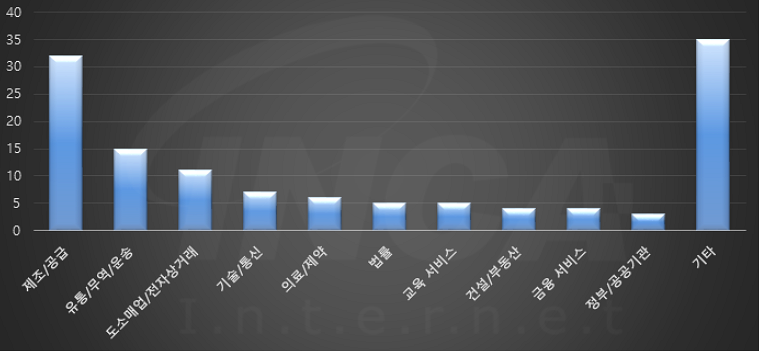 2022년 5월(5월 1일 ~ 5월 31일)에 발생한 데이터 유출 건을 산업별로 비교하였을 때 제조/공급 분야가 가장 많은 공격을 받았고, 유통/무역/운송 분야가 그 뒤를 따랐다.