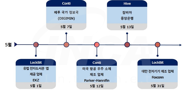 2022년 5월(5월 1일 ~ 5월 31일) 한 달간 랜섬웨어 동향을 조사한 결과, 유럽의 전자도서관 앱 Onleihe의 제공 업체 EKZ가 “LockBit” 랜섬웨어 공격을 받은 정황이 발견됐으며, 페루 국가 정보국(DIGIMIN) 및 미국 항공 우주 소제 제조 업체 Parker-Hannifin이 “Conti” 랜섬웨어 공격을 받은 사건이 있었다. 또한, 잠비아 중앙은행과 대만 전자기기 제조 업체가 각각 “Hive” 랜섬웨어와 “LockBit” 랜섬웨어 공격을 받았다.